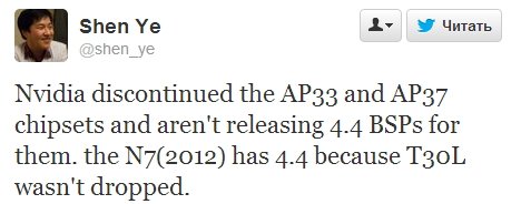 При этом NVidia создали KitKat BSP для T30L, версии процессора, установленной в планшете Nexus 7 2012 года. Возможно, производитель чипов сам решил поддерживать дальше именно этот вариант SoC, однако даже не надо быть поклонником заговоров, чтобы предположить — сделано это под давлением Google.