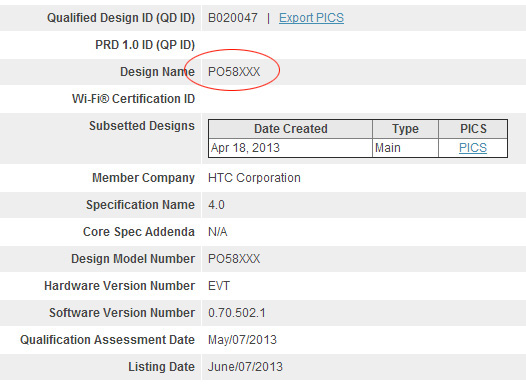 Слухи утверждают, что анонс HTC One mini состоится уже в этом месяце, тогда как начала продаж раньше июля ждать не стоит. Похоже, что эта информация достаточно правдива, ведь устройство от HTC с индексом PO58XXX засветилось на сайте Bluetooth SIG, группой занимающейся разработкой этого стандарта связи и сертификацией устройств, поддерживающих его. Обычно такого типа сертификации проводят перед самым запуском мобильного устройства, предоставляя для них финальную версию аппаратного обеспечения. К сожалению, документ достаточно скудный и мы даже не можем узнать, какие части спецификации поддерживает устройство. Впрочем, обычно HTC не скупятся — смартфоны тайваньского производителя поддерживают даже aptX.
