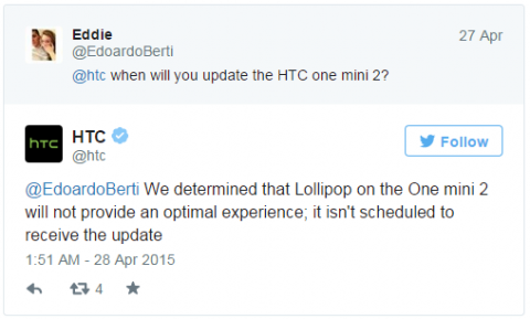 "Мы выяснили, что Lollipop на One mini 2 не будет предоставлять оптимальный пользовательский опыт и не планируем выпускать это обновление", - официально заявила HTC.