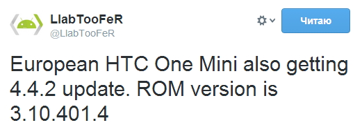 Несколько владельцев HTC One mini, в том числе с российскими CID, сообщили о поступлении большого обновления. Чуть позже в своей Twitter-ленте данную информацию подтвердил и LlabTooFeR. Судя по оповещению на экране, обновление имеет номер 3.10.401.4 и основано на свежайшем варианте мобильной ОС от Google.