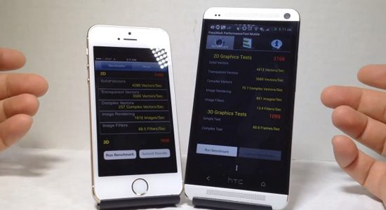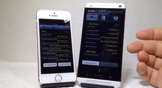 Первым полем для сражения стал кросс-платформенный набор тестов Geekbench 3. Новый смартфон Apple набрал 1 415 баллов в одноядерном режиме и 2 565 — в многоядерном, HTC One же может похвастаться лишь 622 и 1 843 баллами соответственно. Несмотря на такой перевес на стороне iPhone 5S, подробный разбор тестирования показал, что с несколькими операциями Snapdrgon 600 и Android справились быстрее.