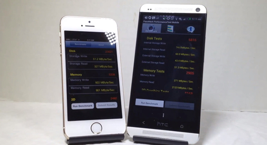 И PassMark PerformanceTest показал уже ожидаемое преимущество Apple iPhone 5S — общая оценка смартфона составила 5 454 балла, тогда как HTC One получил лишь 3 096 баллов. При тестировании процессорных ядер более современная архитектура дала о себе знать — 35 380 и 9 169 баллов. 64-разрядный процессор, даже с меньшей частотой и количеством ядер, в разы быстрее проводит вычисления как с фиксированной, так и с плавающей точкой.