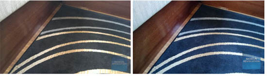 И первое же фото показывает, что камеры действительно разные. Ковер на HTC One практически черный, а лакированные деревянные плинтусы выглядят очень блекло, не ярко. Lumia 720 от Nokia отобразила ковер синим и ярким, плинтусы выглядят более естественно и отражения света на них более заметны. Автор теста утверждает, что ковер действительно синего цвета, хотя и не такого яркого, как на снимке Lumia. Удивительно, но в этом тесте побеждает относительно доступный смартфон Nokia, который к тому же делает более детализированные фото, что заметно даже без увеличения. One смазал весь ковер, превратив ворсинки в плоское покрытие.