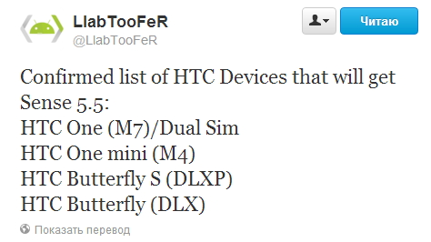 Еще в начале сентября появилась информация, что традиционное полумажорное обновление оболочки HTC должно поступить на топовые смартфоны этого года: HTC One, One mini и Butterfly s. Источником слуха стал хорошо известный разработчик LlabTooFeR, который незадолго до этого предсказал и сам Sense 5.5. Новые данные по обновлению поступили от него же, он подтвердил свежую оболочку для всех озвученных выше устройств, но также добавил новое — HTC Butterfly S. Разработчик предупредил, что список этот не финальный, HTC могут обновить до Sense 5.5 и другие смартфоны.