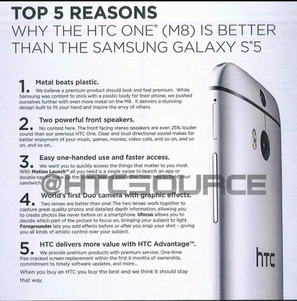 В сеть попали внутренние документы компании HTC, в которых даны рекомендации для представителей розничных сетей, торгующих устройствами тайваньского производителя. Всего перечисляется пять основных свойств HTC One (M8), благодаря которым аппарат выгодно отличается от основного конкурента — Samsung Galaxy S5.