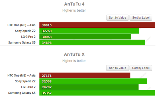 Такие странные несоответствия между «железом» и оценками заставили многих проверить One (M8) в особых версиях бенчмарков, созданных специально для обхода «обмана». В прошлом году HTC и ряд других производителей первого эшелона были пойманы на разгоне процессоров специально под тесты, потому многие создатели данных приложений выпустили их особые варианты. Прогонка азиатского HTC One (M8) в AnTuTu X показала результат в 27 171 балл, он же в обычном AnTuTu набирал 38 815 баллов. С «европейцами» ситуация схожая.