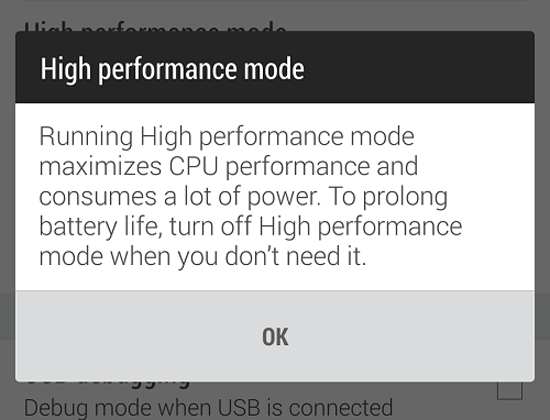 В отличие от Samsung, убравших разгон процессоров под бенчмарки в прошивках на основе Android 4.4.2, тайваньцы не считают его обманом. Он не влияет на работоспособность смартфона, не наносит ему вред, а значит, его можно считать одним из штатных режимов, применимых в ряде ситуаций. В принципе, HTC могут активировать его не только для тестов, но и в некоторых играх, если это потребуется. Компания обещает возможность отключения High Performance Mode с опций разработчика.
