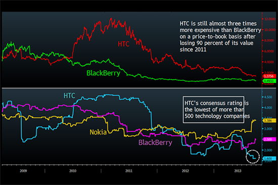 По данным Bloomberg, рыночная стоимость компании HTC упала до минимального за последние восемь лет значения и составила в прошлом месяце 3,8 миллиарда долларов. В 2011 году HTC оценивалась почти в десять раз дороже — 37 миллиардов долларов.