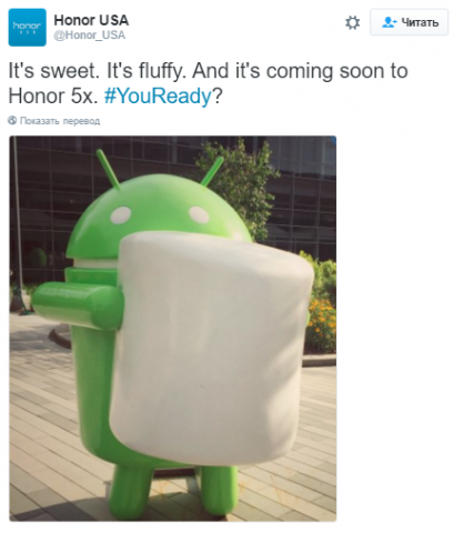 Компания Honor, являющаяся суббрендом Huawei, объявила, что владельцы смартфона Honor 5X уже совсем скоро смогут обновиться до Android 6.0 Marshmallow. Такое сообщение появилось в официальном аккаунте компании в Twitter. Напомним, что смартфон поступил в продажу в январе этого года и на данный момент работает под управлением Android 5.1 Lollipop. К сожалению, производитель не сообщил, каких изменений стоит ждать пользователям с обновлением.