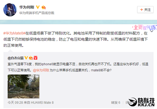 Впрочем, есть гаджеты, которые чувствуют себя очень хорошо, даже тогда, когда столбик термометра опускается ниже нулевой отметки и в самый трескучий мороз. В одном из своих микроблогов глава Huawei Terminal «подколол» iPhone 5, 5S, 6 и 6S за их «изнеженную натуру», неспособную противостоять низким температурам. В то время как Huawei Mate 8 будет функционировать даже в лютые морозы. Достигнуто это за счет того, что при создании аккумулятор используется специальный материал, способный переносить низкие температуры, и он предотвращает возрастание внутреннего сопротивления батареи и препятствует быстрой потере энергии.