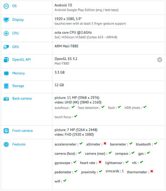 В соответствии с данными тестировщика, смартфон получит мощный 8-ядерный чип с частотой 2,6 ГГц и ускорителем Mali-T880. Объем ОЗУ составит 3 ГБ, встроенной же — 64 ГБ. Камеры — 12 и 8 Мп. Работает смартфон на базе новейшей Android 7.0 Nougat.