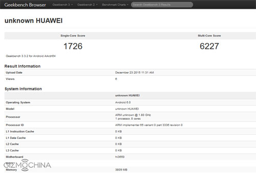 Бенчмарк оказался не слишком информативен. И мы знаем лишь то, что помимо мощного чипсета Kirin 950 в смартфоне установлены 4 ГБ оперативной памяти и операционная система Android 6.0, обеспечившие ему вполне приличную производительность в 1726 и 6227 баллов в одно- и многоядерном режиме тестирования Geekbench.