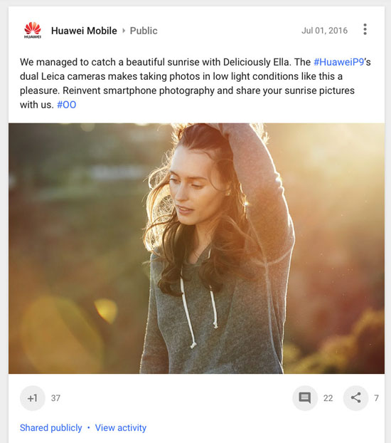В публикации на официальной странице Huawei в Google+ говорится, что компании удалось «запечатлеть красивый восход», а камера Huawei P9 с оптикой от Leica делает процесс фотосъёмки в условиях недостаточной освещенности гораздо более приятным.
