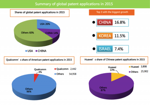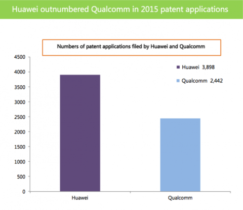 Всемирная организация интеллектуальной собственности (ВОИС) заявила, что за минувший год количество заявок на патенты достигло рекордного значения в 218 000 штук. Среди стран лидером традиционно являются США, а среди международных компаний уже второй год подряд лидером по количеству поданных патентных заявок становится китайская компания Huawei. Как утверждает сам производитель, число его заявок составляет 3 898 штук. Компания получает патенты не только в Китае, но и за пределами страны: по данным ежегодного доклада Европейского патентного ведомства, компания Huawei занимает девятое место в Европе по количеству зарегистрированных в 2015 году патентов - 498.