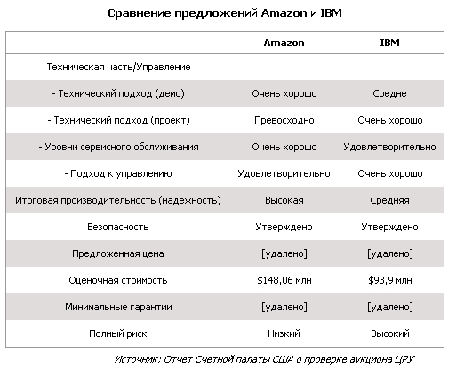«ЦРУ выбрало Amazon Web Services на основе превосходства этой технологической платформы, которая позволяет нам двигаться инновационным путем и быть уверенными в необходимом уровне безопасности для решения критически важных задач», - заявил пресс-секретарь агентства. Счетную палату этот аргумент не устроил.