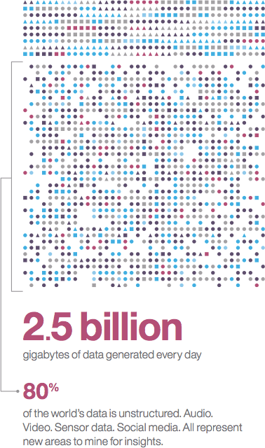 Каждый день мир генерирует 2,5 миллиарда гигабайтов данных, и 80% из них — это неструктурированные данные (иллюстрация из отчёта IBM).