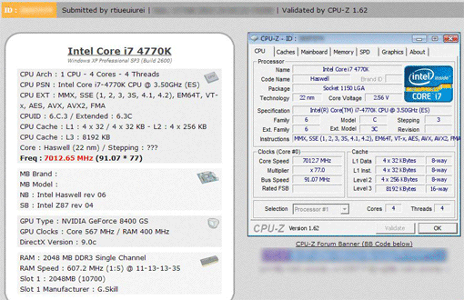 Один из оверклокеров под ником rtiueuiurei опубликовал в базе CPU-Z результаты разгона инженерного образца (Engineering Sample (ES)) процессора Core i7 4770K. Как видно из скриншотов, ему удалось повысить напряжение на микросхеме до 2,56 В и разогнать процессор до 7012,65 МГц.