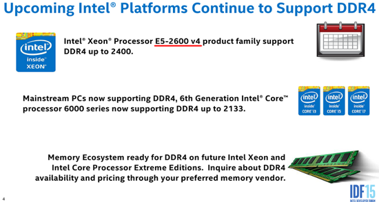 Ввиду агрессивного продвижения платформы Skylake эта новость не удивила никого, однако сейчас мы видим, что компания явно не справляется с обеспечением спроса на новые 14-нанометровые чипы — налицо глобальный дефицит, и сама Intel это подтверждает, обещая вскоре исправить ситуацию. В новых планах Intel по продвижению экосистемы памяти DDR4 появилась интересная информация, которая может свидетельствовать о пересмотре решения об отмене выпуска процессоров Broadwell-EP. На одном из слайдов упоминается поддержка DDR4 с частотой до 2400 МГц для неких процессоров Xeon E5-2600 v4. Таких процессоров пока не существует, далее в той же презентации говорится о Xeon E5-2600 v3 (Haswell) — эти процессоры на сегодняшний день поддерживают DDR4 с частотой до 2133 МГц.