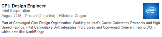 Неназванный инженер из Intel, базирующийся в Хиллсборо (штат Орегон), раскрыл в своём профиле профессиональной социальной сети LinkedIn, что в последние два месяца он работал над «протоколами когерентности кешей и высокопроизводительной базовой структурой» для систем на кристалле Intel Cannonlake с четырьмя, шестью или восемью ядрами и «когерентной базовой структурой». Запись была замечена журналистами с сайта Fool.com, но на момент публикации заметки была удалена или изменена владельцем.