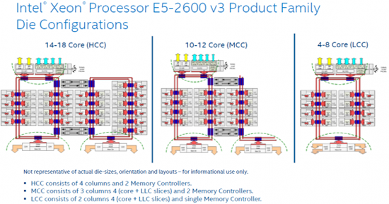 Intel разрабатывает многочисленные версии своих микропроцессоров для различных приложений. Например, в семействах Haswell, Broadwell и Skylake имеются два отдельных кристалла — с двумя или четырьмя x86-ядрами — для клиентских (настольных и мобильных) персональных компьютеров. Для высокопроизводительных десктопов, рабочих станций и серверов компания типично разрабатывает три кристалла: LCC с 4-8 ядрами, MCC с 10-12 ядрами и HCC — с 14-18 ядрами в случае с семейством Haswell.