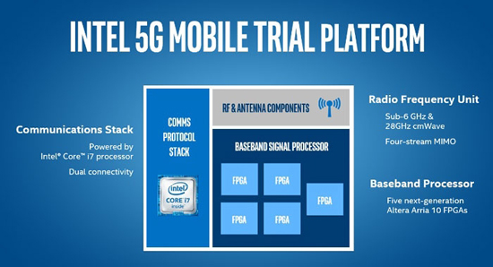 Всё вышесказанное — это не пустые слова. Компания Intel уже сейчас готова предоставить платформы и решения для создания ранних прототипов устройств и оборудования для сотовых сетей пятого поколения. Платформа Intel опирается на широкополосный процессор в виде FPGA Altera Arria 10, отдельный радиочастотный модуль с антенной, работающий на частоте свыше 6 ГГц и на систему обслуживания протокола связи на базе платформы с процессором Intel Core i7. Заинтересованные могут обращаться.