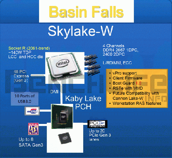 Кроме того, компания планирует к выпуску совершенно новую серию процессоров под кодовым названием Skylake-W. Они нацеливаются на рынок недорогих рабочих станций с одним процессорным разъёмом и будут базироваться на платформе Basin Falls. Чипы будут иметь много общего со Skylake-X (платформа HEDT в исполнении Intel всегда является близким родственником Xeon). Чипсет, общий для обеих платформ, пока известен под названием Kaby Lake PCH; он будет совместим и с будущими 10-нм чипами Cannonlake-X и Cannonlake-W. Процессоры Skylake-W будут использовать как кристаллы LCC (малоядерные), так и HCC (многоядерные), максимальное количество ядер достигнет 28.
