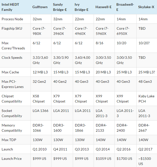 Последние доступные широкой публике благодаря усилиям зарубежного ресурса Benchlife планы Intel предусматривают выпуск новых процессоров класса HEDT во втором квартале 2017 года. Это будут чипы под кодовыми названиями Skylake-X и Kaby Lake-X, хотя ранее традиционно для обозначения данного класса использовался суффикс Е. Оба семейства будут базироваться на текущем 14-нанометровом процессе, версия Skylake-X получит архитектуру, неотличимую от существующей сейчас в настольных чипах Skylake, а вот Kaby Lake, находясь в следующей фазе нового трёхтактного цикла Intel, сможет похвастаться оптимизациями кристалла.