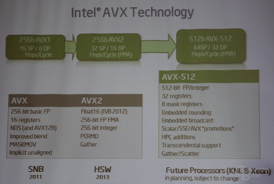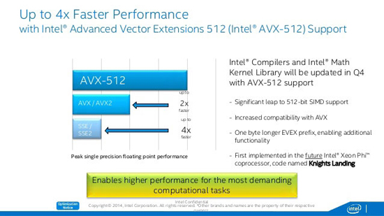 На днях компания Intel обновила руководство для программистов по работе с расширенным набором инструкций AVX-512. Ожидалось, что блоки для обработки целочисленных значений и значений с плавающей запятой с поддержкой 512-бит команд появятся в составе процессоров Intel 14-нм поколения Skylake. Потом стало известно, что в поколении Skylake поддержка AVX-512 будет только в составе серверных процессоров Intel Xeon и ускорителей расчётов Xeon Phi (в 14-нм поколении ускорителей Knights Landing). В составе ускорителей Knights Landing обещана поддержка большего набора расширений AVX-512, чем в случае процессоров Xeon общего назначения. Это объясняется тем, что расширенный набор инструкций AVX-512 нацелен на развитие параллелизма в расчётах, что на данном этапе проще реализовать (и с лучшей отдачей) в ускорителях вычислений.