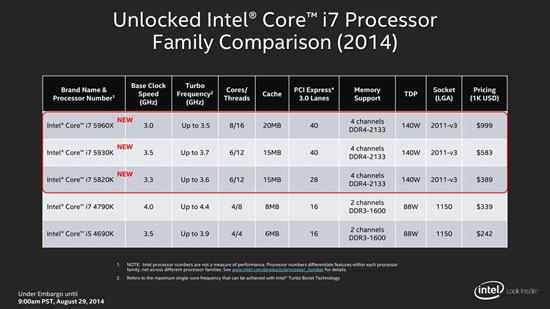И о ценах. Модель Core i7-5960X обойдётся в $999, в то время как за модификации Core i7-5930K и Core i7-5820K придётся заплатить соответственно $583 и $389.