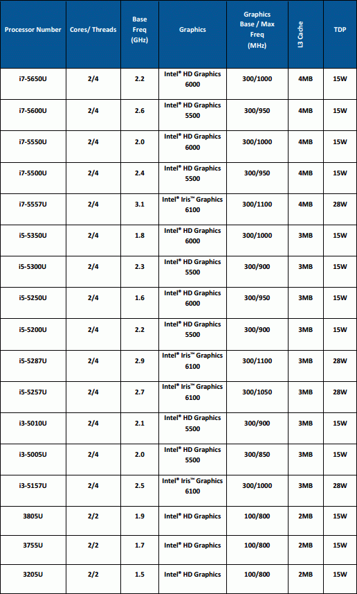 Ассортимент представленных процессоров Broadwell с перечислением основных характеристик описан в таблице. В зависимости от модели, значение TDP колеблется от 15 до 28 Вт, количество физических вычислительных ядер не превышает двух, а графическая подсистема выбирается из следующего ряда: Intel HD, Intel HD 5500, Intel HD 6000, Intel Iris 6100. Объём кэша третьего уровня может достигать 4 МБ.