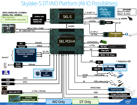 Разумеется, будет реализована поддержка vPro и TurboBoost, а также всех современных актуальных наборов инструкций, включая AVX 3.2. Кроме того, чипы с архитектурой Skylake будут содержать в себе ряд специализированных блоков-ускорителей, например, аппаратные декодеры HEVC и VP9, механизмы защиты памяти MPX, расширения SHA-1 и SHA-256, новые расширения ADX (multi-precision add-carry instruction extensions) и другие нововведения. Благодаря низкому уровню энергопотребления устройства на базе Skylake можно будет сделать либо тоньше и легче, либо увеличить срок работы от батарей, и в обоих случаях эти решения вполне подойдут для серьёзной работы и требовательных развлекательных приложений.