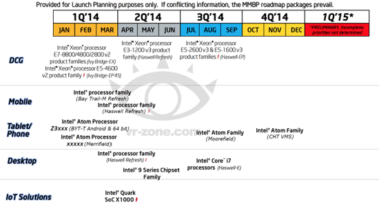 Апрель будет ознаменован запуском улучшенных процессоров Intel Haswell Refresh для настольных компьютеров и ноутбуков, а также выходом однокристальных энергоэффективных систем Intel Quark X1000, нацеленных на перспективные рынки носимой электроники и Интернета вещей. В мае на полках магазинов начнут появляться материнские платы серии 9. Затем в августе ожидается запуск настольных процессоров Haswell Refresh серии K и Haswell-E, которые будут использовать чипсет X99 и поддерживать памяти DDR4.