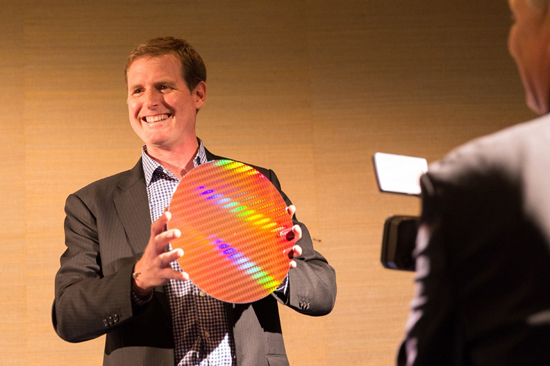 Представитель Intel Адам Кинг демонстрирует пластину с 14-нм чипами
