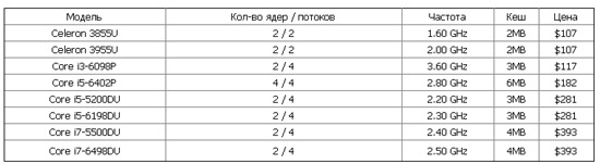 С ULV-моделями Celeron 3855U и 3955U всё гораздо понятнее — они приходят на смену Celeron 3215U и 3765U, работают на частотах 1,6 и 2 ГГц соответственно, имеют два ядра, 2 Мбайт кеша L3, интегрированную графику Intel HD Graphics 510 и не поддерживают технологию HyperThreading.