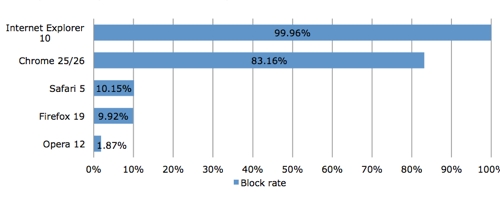 IE10 продемонстировал наиболее эффективную защиту, обнаружив вредоносные ссылки в 99,96% случаях. На втором месте - Google Chrome 25/26, который показал эффективность 83,16%. Веб-браузеры Safari 5 и Firefox 19 заняли соответственно третье и четвертое места с показателями 10,15% и 9,92%. Opera 12 смогла обнаружить вредоносные ссылки в 1,87% случаях.