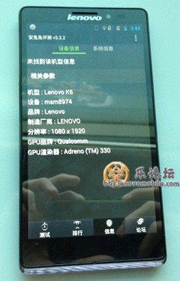 Судя по бенчмарку AnTuTu, телефон работает на свежем чипсете Qualcomm MSM8974 с центральным процессором Snapdragon 800 и графикой Adreno 330, а разрешение его экрана (скорее всего, пятидюймового) составляет 1920×1080 пикселей. Вероятно, в ближайшем времени Lenovo представит это устройство, и оно станет новым флагманом компании, «наследником» K900 на базе процессора Intel.