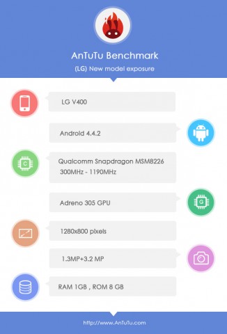 В минувший понедельник компания LG анонсировала три новых планшета линейки G Pad. Тем временем самая младшая модель (LG V400) уже прошла тестирование в бенчмарке AnTuTu, и нам стали известны технические спецификации планшета. LG G Pad 7 получит 7-дюймовый дисплей с разрешением 1280x800 пикселей, четырехъядерный процессор Snapdragon 400 с тактовой частотой 1,2 ГГц, графический ускоритель Adreno 305, 1 ГБ оперативной памяти, 8 ГБ встроенной памяти, 3,2-мегапиксельную основную и 1,3-мегапиксельную фронтальную камеры.
