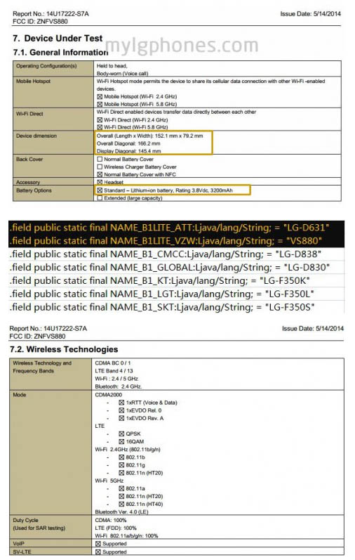 Устройство под кодовым названием LG-VS880 прошло сертификацию в Федеральном агентстве по связи (FCC). Судя по всему, перед нами версия LG G Pro 2 lite для американского оператора связи Verizon. Между тем LG-D631 станет операторской версией AT&T, а LG-LS885 предназначен для Sprint. Согласно документации агентства, LG G Pro 2 lite получит 5,7-дюймовый дисплей и аккумулятор ёмкостью 3 000 мАч. Габариты устройства составят 152,1 х 79,2 мм.