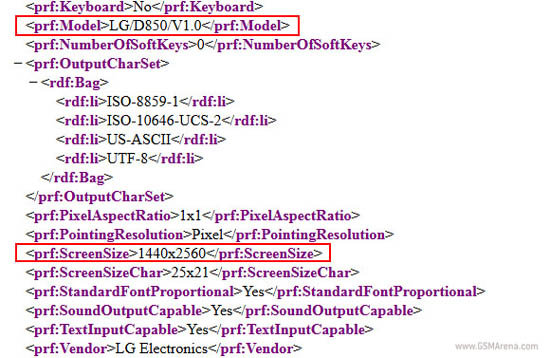 XML-записи в User Agent Profile свидетельствуют, что модель LG D850 оснащена дисплеем с разрешающей способностью 2560 на 1440 пикселей. Схема внутреннего именования устройств LG следующая: G2 проходит под условным обозначением D800, Nexus 5 известен как D820, а G Pro 2 наделен меткой D830 — стало быть, D850 и есть наш G3.