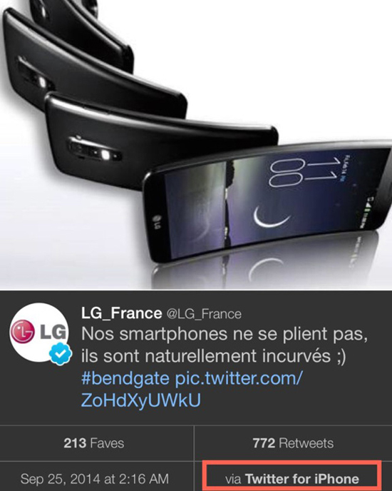 LG испортила шутку о «гнущемся» iPhone 6 Plus, отправив твит с iPhone