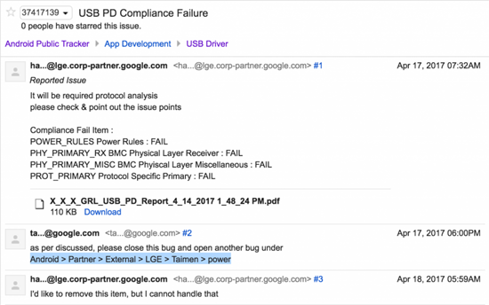 Также появилась информация, что производителем Google Pixel (Taimen) может стать компания LG, с которой Google выпустила смартфоны Nexus 4, Nexus 5 и Nexus 5X. Источник продемонстрировал переписку разработчиков, в которой один из них просит заняться каким-то другим багом и указал путь: Android > Partner > External > LGE > Taimen > power.