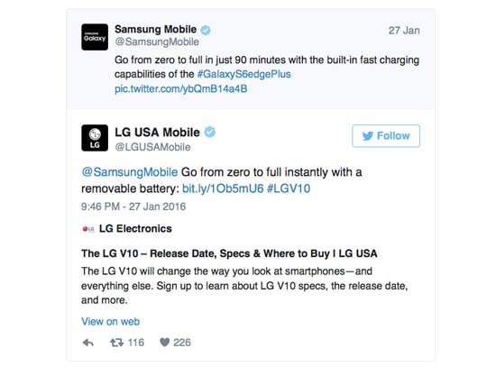 Поводом для данного предположения послужила публикация сообщения в официальном микроблоге LG. Все началось с того, что Samsung разместила в своем аккаунте изображение смартфона Galaxy S6 edge+, написав о том, что технология быстрой зарядки позволяет полностью зарядить смартфон за 1,5 часа. «От нуля до 100% благодаря встроенной технологии беспроводной зарядки», – написали в корейцы.