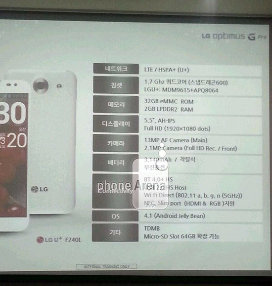 Ресурс phoneArena опубликовал фото смартфона Optimus G Pro с 5,5-дюймовым экраном с разрешением Full HD. Напомним, в январе LG официально представила Optimus G Pro с 5-дюймовым экраном. Аппарат предназначается для Японии, Южной Кореи и, вероятно, других регионов. Обновленный смартфон с увеличенным экраном также получил более емкую батарею — 3140 мАч.