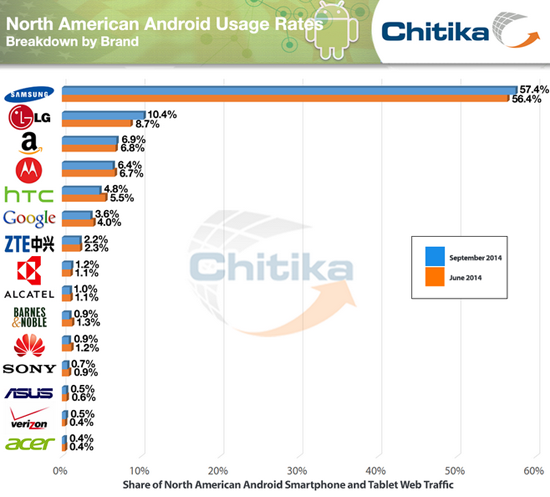 Компания LG широко представлена в сегменте смартфонов и планшетов относительно недавно, но ее прогресс, что называется, на лицо. Аналитическое агентство Chitika опубликовало рейтинг мобильных брендов, чьи смартфоны чаще все поглощали интернет-трафик на территории Северной Америки в период с 1 по 30 сентября и сравнило его с аналогичными показателями июня этого года. Как выяснилось, корейский бренд сумел занести в свой актив 1,7% (с 8,7 до 10,4%) и выбрался на вторую строчку общего рейтинга Android-смартфонов и планшетов. Лидирует с большим отрывом другой корейский гигант Samsung – 57,4% (против 56,7% в июне). Зато LG смогла оставить позади такие компании, как Amazon (6,9%), Motorola (6,4%), HTC (4,8%) и Google (3,6%). Sony за три месяца потеряла еще 0,2% и теперь ее доля всего 0,7%. Именитый японский бренд теперь уступает многим китайским компаниям, таким как ZTE и Huawei.