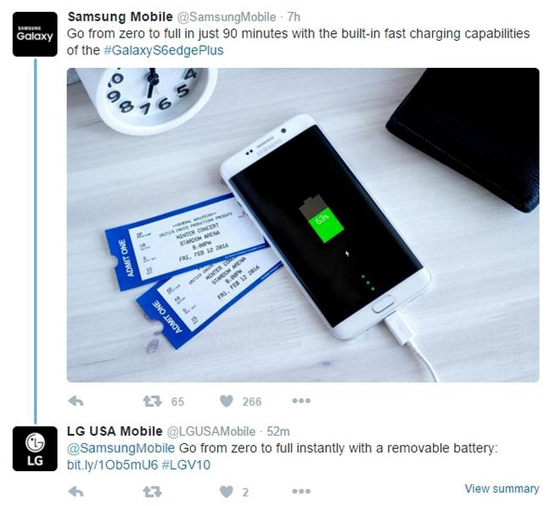 Вчера в твитере Samsung Mobile напомнила миру, что Galaxy 6S Edge Plus можно полностью зарядить всего за 90 минут благодаря встроенной технологии быстрой зарядки. На это LG ответила, что со сменной батареей это можно сделать мгновенно, сопроводив ответ ссылкой на LG V10.