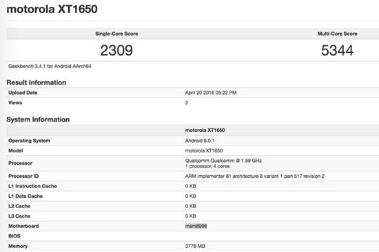 Мы уже неоднократно видели фото и пресс-рендры Moto G нового поколения от компании Lenovo. А как обстоят дела с флагманским Moto X, ждать ли его в этом году? Бенчмарк GeekBench отвечает на этот вопрос утвердительно. Сегодня в базе данных сервиса был найден смартфон под кодовым названием XT1650. Источник утверждает, что это имя принадлежит следующему флагману из серии Moto X, что может оказаться правдой, ведь Moto X Pure Edition, например, достался модельный номер XT-1575. Если это действительно так, то нас ждет смартфон с 4-ядерным процессором Qualcomm Snapdragon 820, 4 ГБ оперативной памяти и операционной системой Android 6.0.1 «из коробки». Впрочем, если премьера нового Moto X состоится 9 июня, как ранее обещал руководитель Lenovo, то есть небольшая вероятность того, что девайс будет работать под управлением Android N, ведь анонс гаджет пройдет уже после конференции Google I/O 2016. Судя по последним тенденциям в сегменте флагманов, Moto X будет предлагать пользователям как минимум 32 ГБ встроенной памяти, также не стоит исключать возможность появления 64-ГБ вариации, шансы достаточно высоки. Результаты Moto X в GeekBench составляют 2309 очков в тесте с одним ядром и 5344 баллов в проверке с применением всех ядер. Это немного больше, чем у OnePlus 3, который всплыл в Сети ранее.