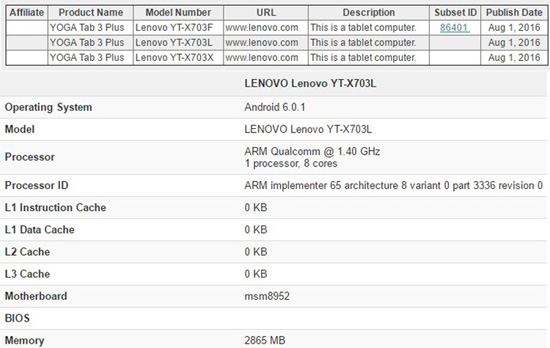 Lenovo готовит планшет Yoga Tab 3 Plus на платформе Qualcomm Snapdragon 617