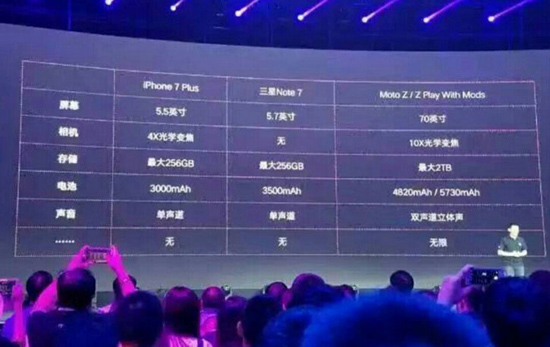 В рамках презентации смартфонов линейки Moto Z в Китае компания Lenovo продемонстрировала публике сравнительный слайд с характеристиками iPhone 7 Plus. Для 5,5-дюймовой новинки Apple указаны следующие спецификации: 5,5-дюймовый экран, накопитель с объемом до 256 ГБ, батарея емкостью 3000 мАч и 4-кратный оптический зум.