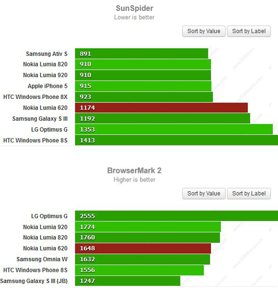 Nokia Lumia 620, младшая модель в линейке смартфонов на Windows Phone 8, уже «засветилась» в бенчмарках (тестах производительности), в которых продемонстрировала неожиданно высокую скорость работы – по крайней мере, при просмотре веб-страниц. Перед вами результаты двух различных браузерных тестов, в которых недорогой смартфон показывает результаты, сопоставимые как с другими устройствами на Windows Phone 8, так и с флагманами на Android.