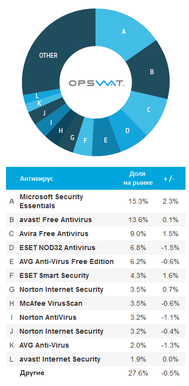 В то время как количество пользователей Avira Free Anvirus увеличилось на 1,5%, антивирус ESET NOD32 потерял столько же. В рядах пользователей AVG AntiVirus также наблюдается сокращение более чем на 1%.